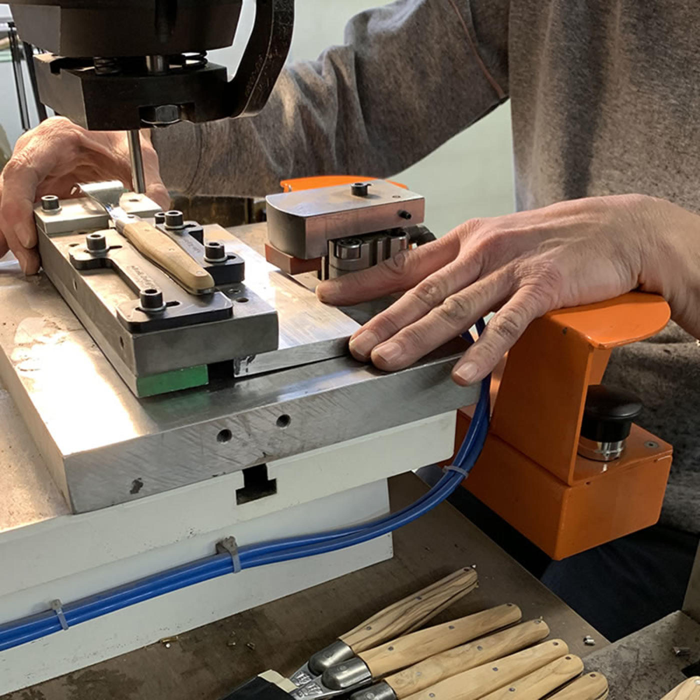 The wooden, real horn or acrylic handles are then assembled with their blade.